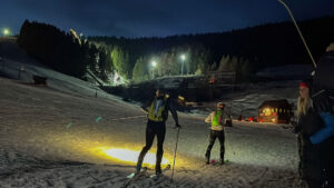 A mass of 102 people sprints toward their skis, quickly putting them on, and the race begins. To me and Stefan, it felt like it took an eternity to get our skis on, but after a short flat section, we make it into the lead group. The first climb goes up a black ski slope, the steepest one under the Vierersesselbahn quad chairlift. I’m absolutely certain my heart rate must be somewhere around 190 at this point. In the first half of the hill, I’m surprised. We’re in the top 5 when, suddenly, Stefan flies past me at supersonic speed. With long, steady strides, he moves into third place.