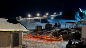The seventh piece of wood goes into my pocket, and it’s back down the black slope. Despite a full day of skiing, the slope is too destroyed, and the descent goes pretty smoothly. The next climb, however, is the dreaded ski jump, also known as the Stairway to Heaven. A sharp right turn leads into the landing area, and from there, we skate our way toward the stairs. Here, skis go onto the backpack, and we run up the steep incline inside the ski jump’s landing. At the top is another transition area, but I barely register what’s happening. All I know is that the mood here is great, with motivational music setting the tone. I quickly strap my skis back on and push downhill toward the next transition.